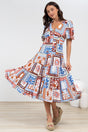 Sivana Midi Dress - V-Neck Buttoned Down Dress with Short Sleeves in Lirael Print