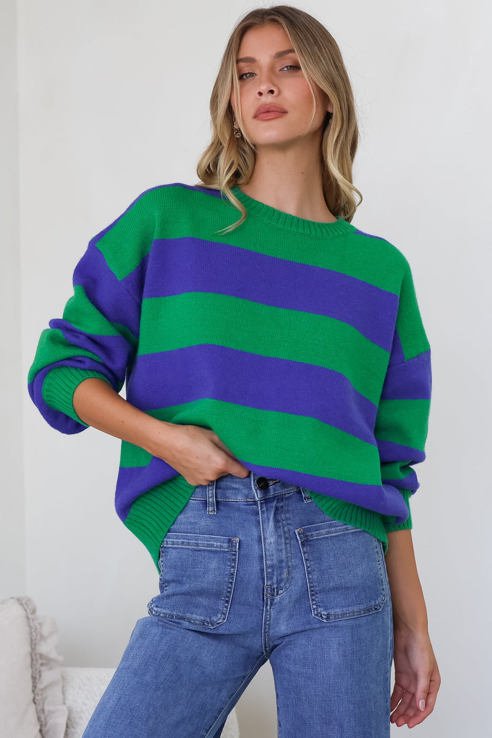 The Atlantic Jumper in Green is the kind of piece that makes getting dressed feel easy. The relaxed stripe knit has a laid-back, nautical-inspired charm that feels fresh and fashion-forward, while the rich green palette adds a nature-inspired warmth that pairs beautifully with denim, cream, and earthy neutrals. Style it tucked into high-waisted jeans for a polished everyday look, or wear it loose over leggings for the ultimate cosy-chic weekend outfit.