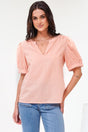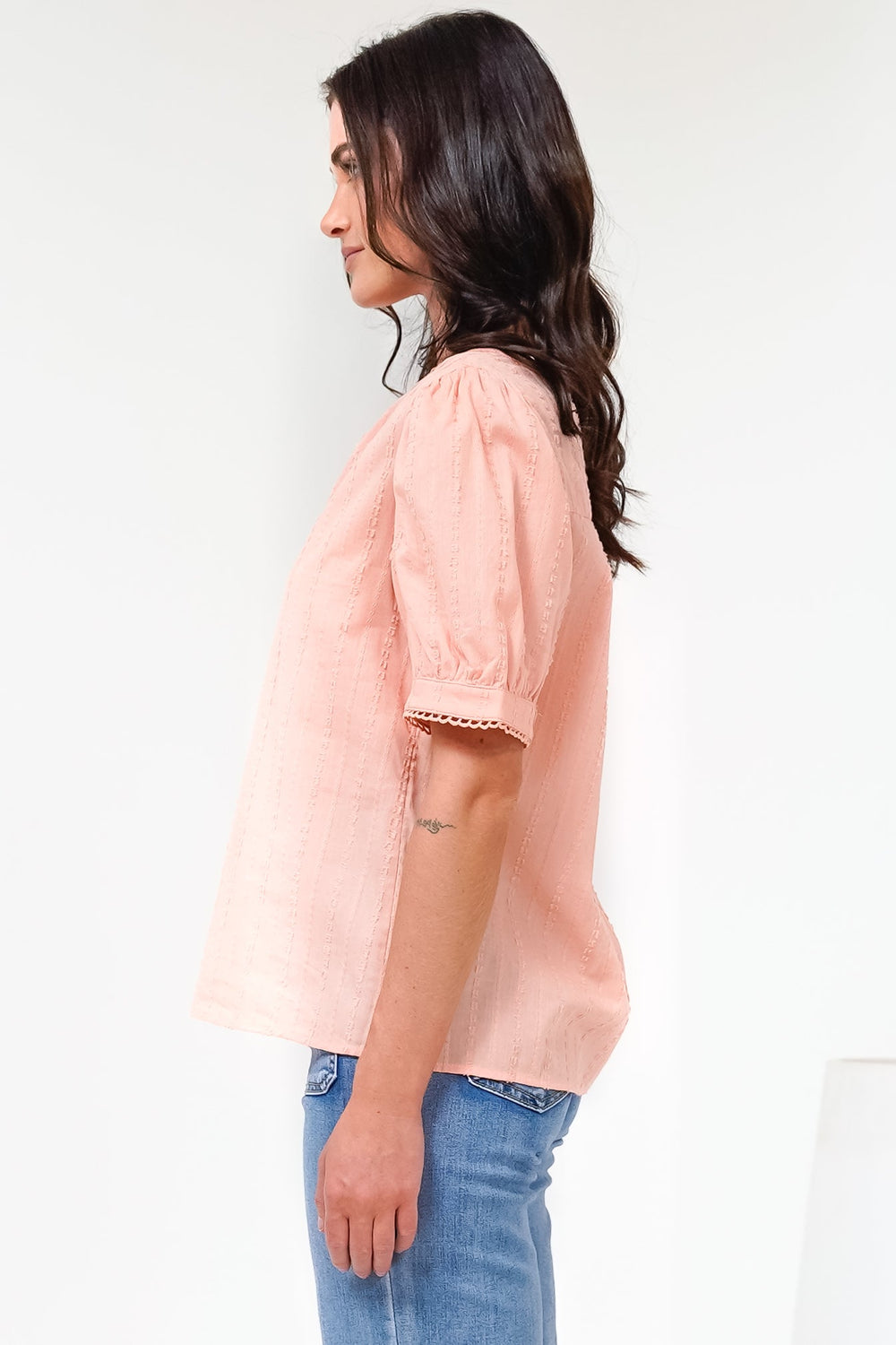 Loyalty Top - Textured V-Neck Split Collar Top with Puff Sleeves and Scallop Trims in Peach