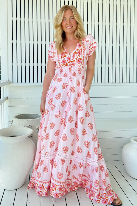JAASE - Romi Maxi Dress: Button Down Cap Sleeve Dress with Waist Tie in Josianne Print