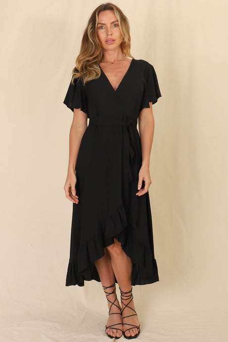 • Carolina Midi Dress - V Neck Wrap Dress with Ruffle High Low Hemline in Black