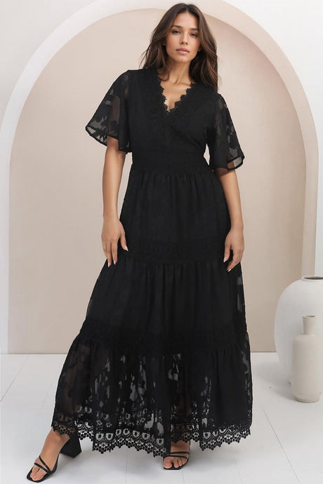 • Madeline Maxi Dress - Lace Trim Embroidered A Line Dress in Black