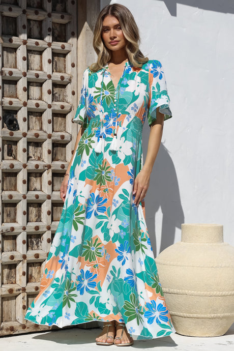 Maeana Maxi Dress - Short Balloon Sleeeve Elasticated Waist A Line Dress in Valerie Print
