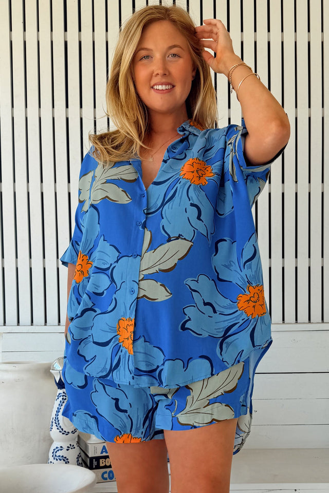 JAASE - River Shirt: Oversized Button Down Shirt with Scoop High-Low Hem in Blue Bell Print