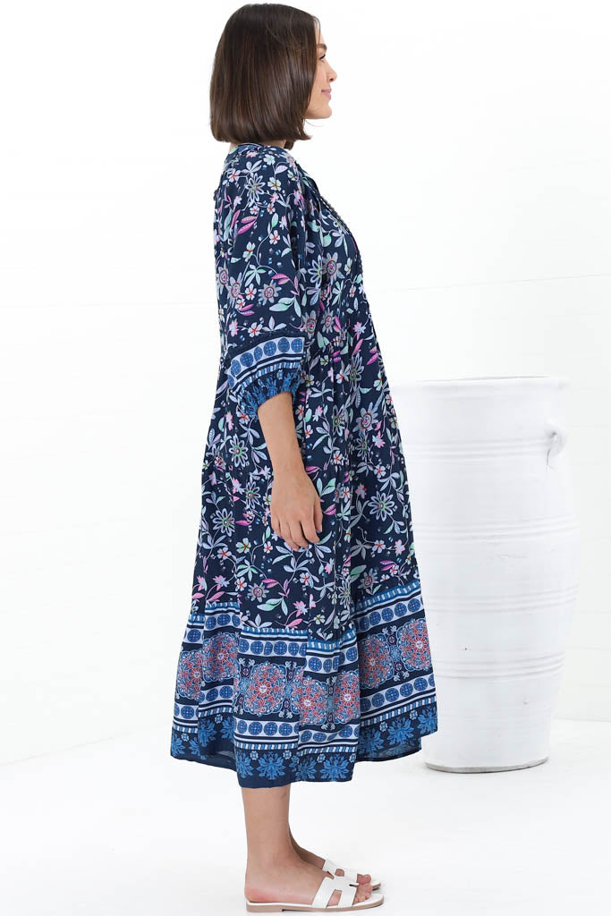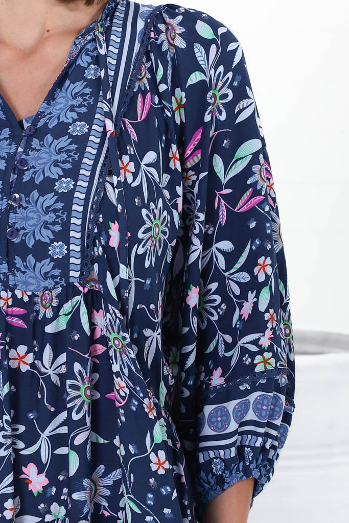 Kamali Midi Dress - Batwing Sleeve Smock Dress with Lace Detailing in Belle Print Navy