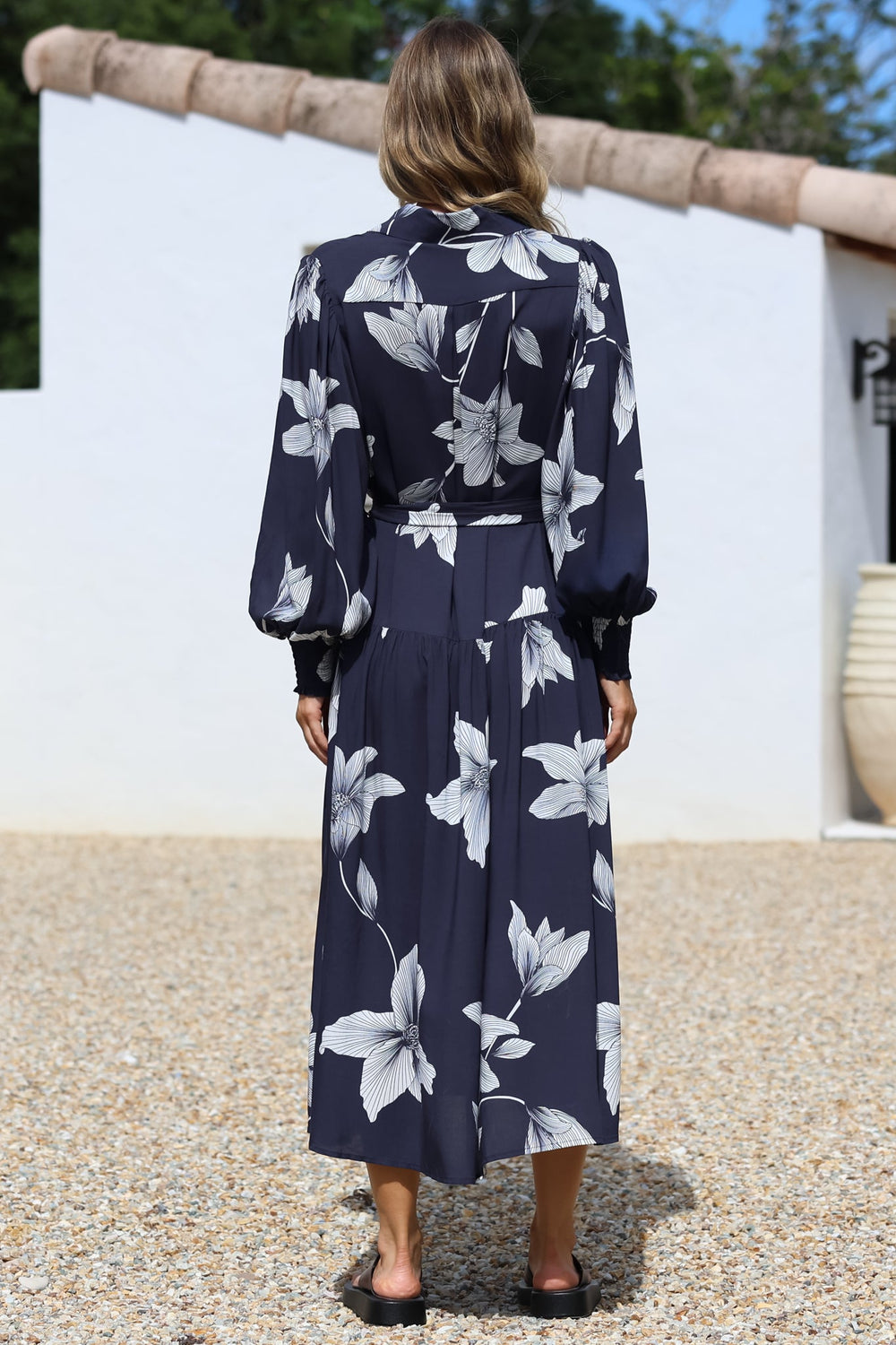 Skandi Midi Dress - Button Down Billow Sleeve Shirt Dress with Waist Tie in Midnight Lily Print