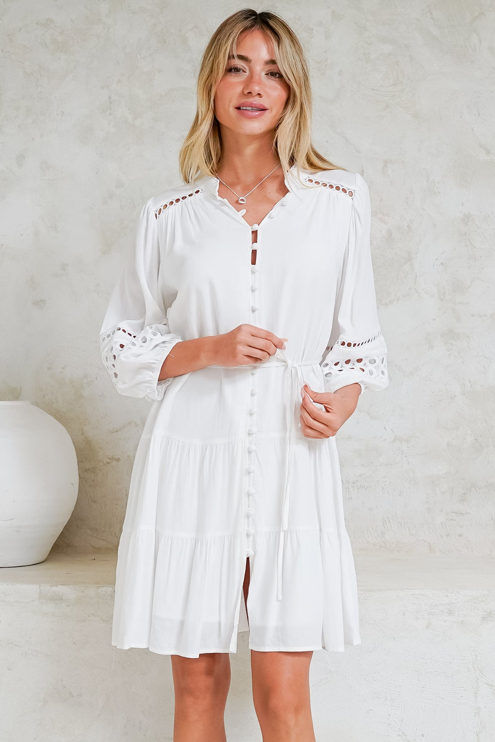 Alyce Mini Dress - Button Down Dress with Cut Out Detailed Sleeves and Matching Belt in White