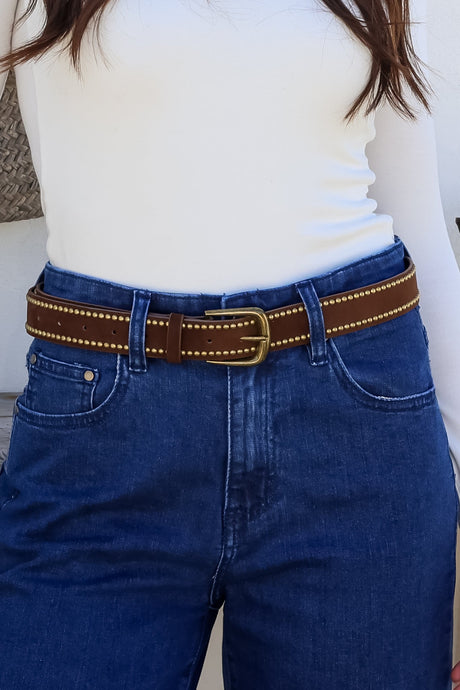 Jace PU Leather Gold Buckle Studded Belt - Velvet Brown