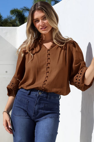 Savvy Blouse - Milkmaid Neckline Lace Trim Button Down in Roux Print
