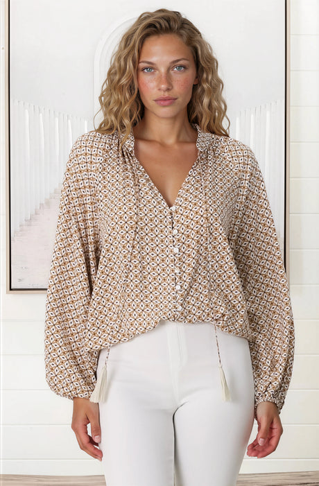 Romy Shirt - Collared Button Down with Long Sleeves in Stassie Print Brown