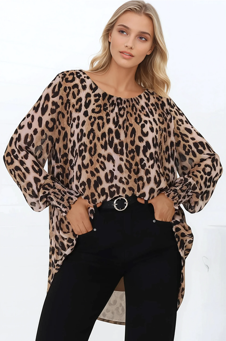 Kayt Blouse - Plisse Long Sleeve Top with High-Low Hemline in Leopard Print