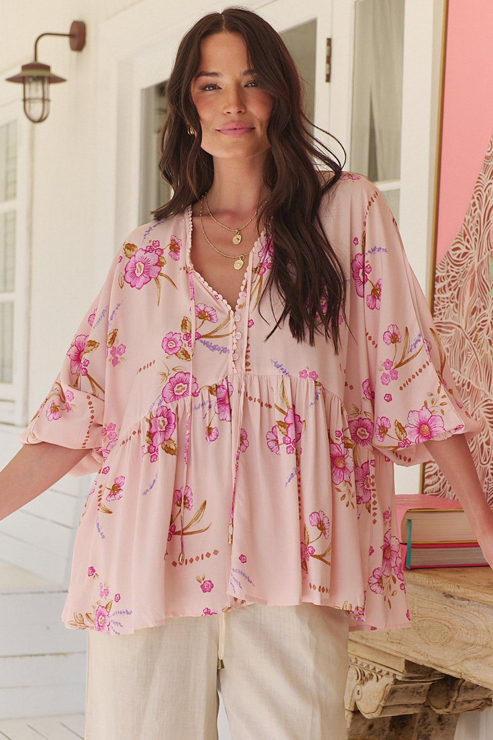 JAASE - Chloe Top: Very Oversized Crochet Trim Neckline Smock Top in Blushing Fields Print