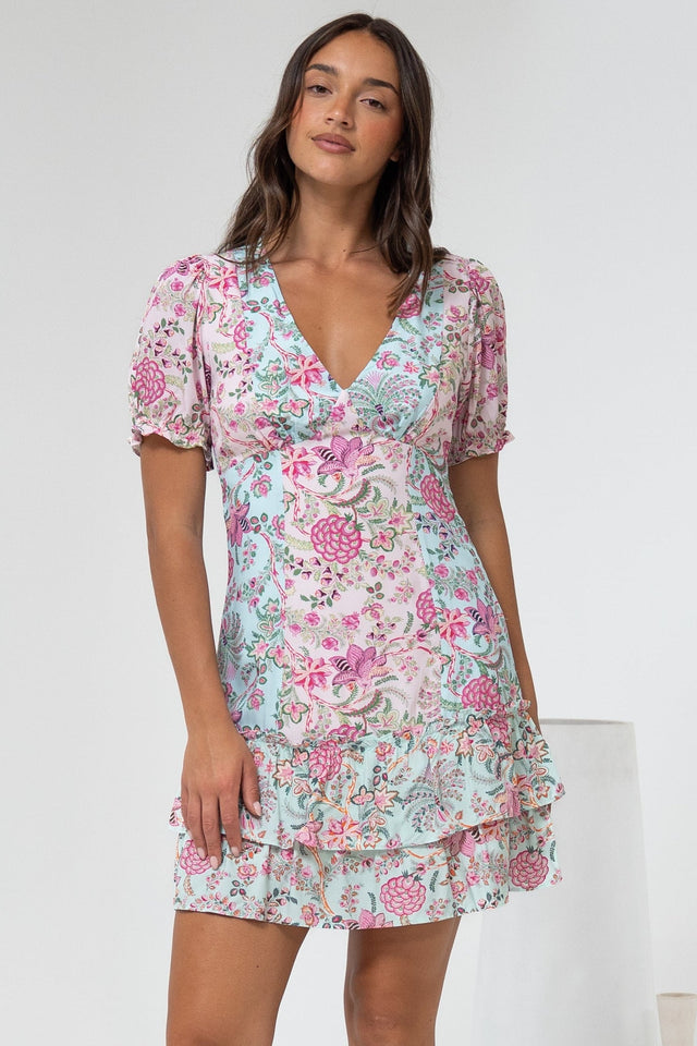 The Jeannie Mini Dress is a flirty and feminine must-have for sunny days and special occasions. Featuring a vibrant floral print, tiered ruffle hem, and a flattering fitted bodice with puff sleeves, it’s the perfect blend of playful charm and effortless style.