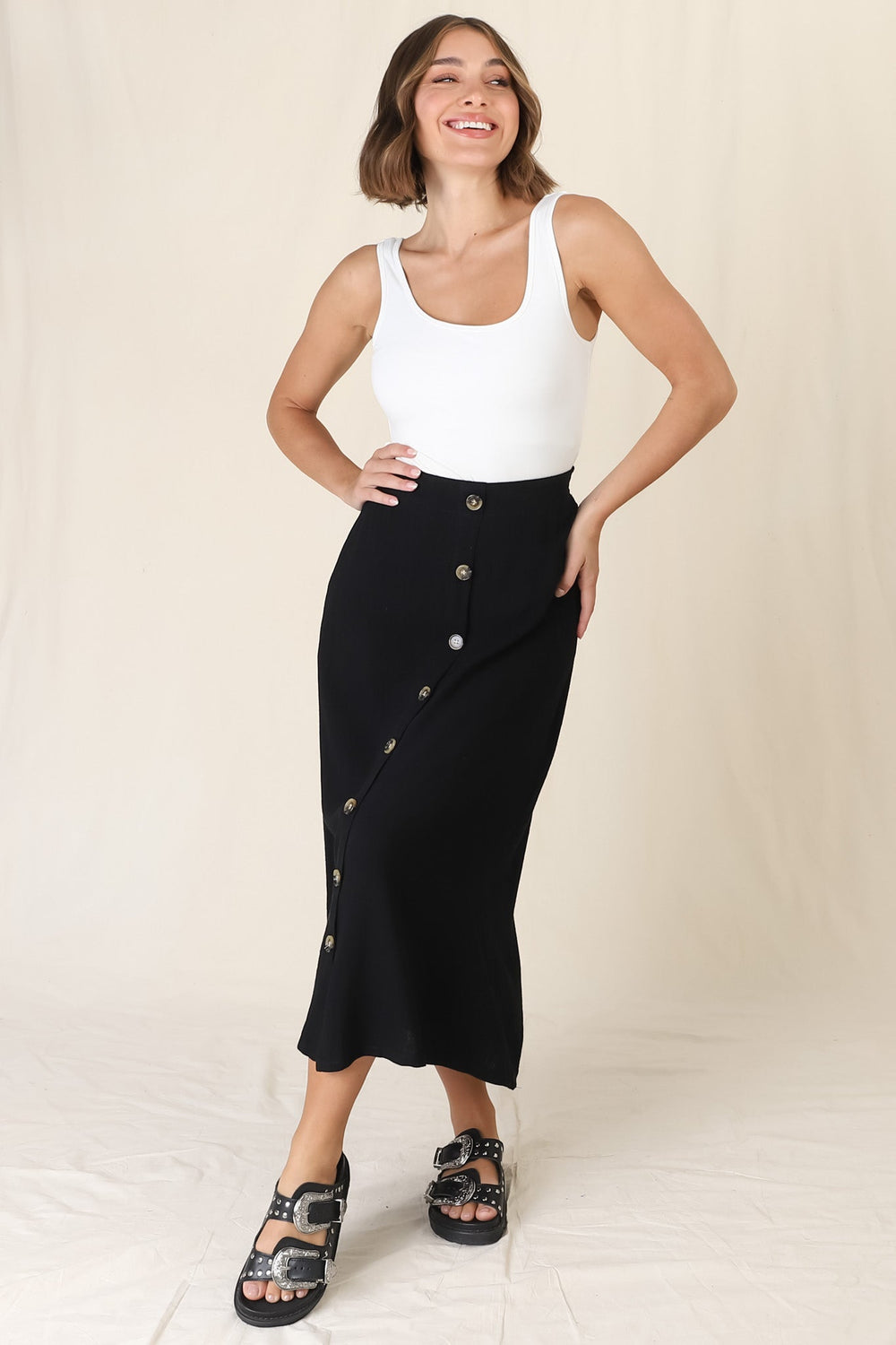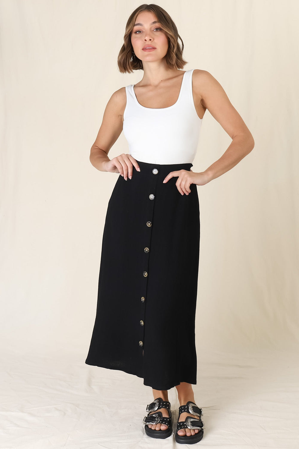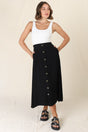 Murphy Midi Skirt - High Waisted Button Decal A-Line Skirt in Black