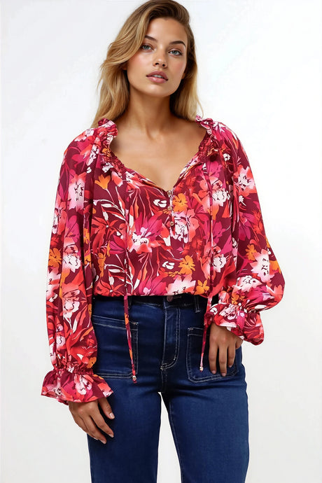 Violet Blouse - Frill Collar Button Down Balloon Sleeve Blouse In Ginnee Print
