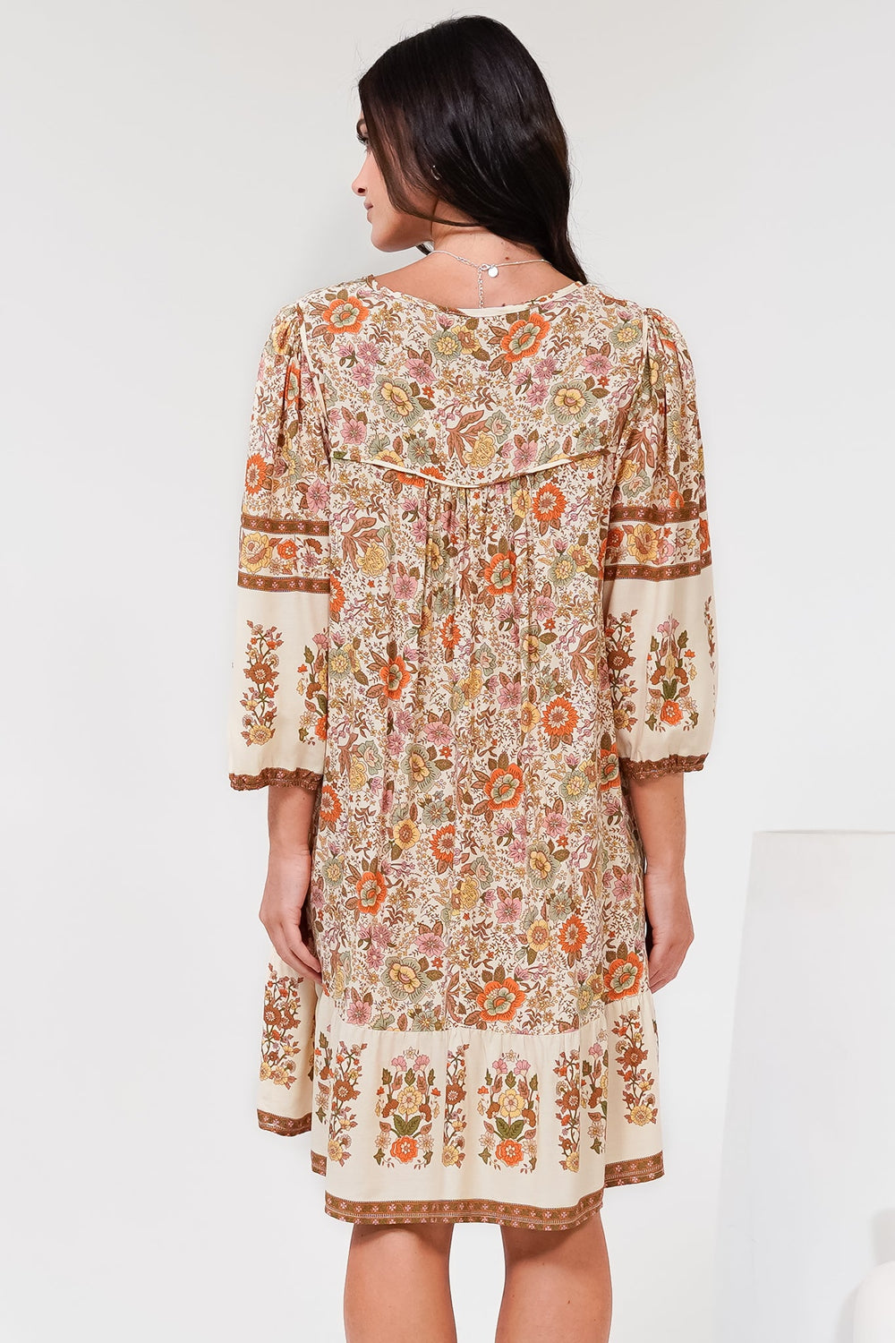 Helda Mini Dress - V-Neck Shift Dress with Balloon Sleeves in Aletta Print Brown