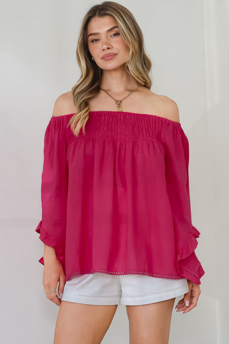 Aviva Top - Off Shoulder Handkerchief Sleeve Pull Over in Hot Pink