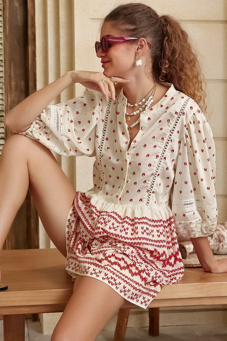 Acacia Blouse - Button Down Short Balloon Sleeve Shirt with Buttoned Cuffs in Sheree Print