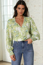 Moree Blouse - Frill Collar Neck Tie Button Down Shirt in Franc Print Lime
