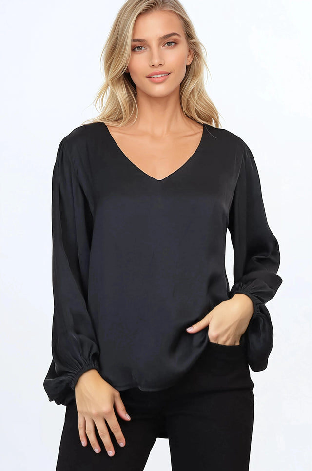 Morgana Blouse - Soft V-Neckline Pull Over Top with Balloon Sleeves in Black