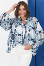 Portia Blouse - Button Down Lace Detail Shirt in Calea Blue Print