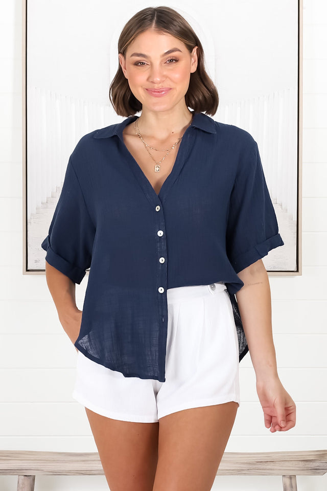 Shelly Shirt - Linen Collared Button Down Shirt in Navy
