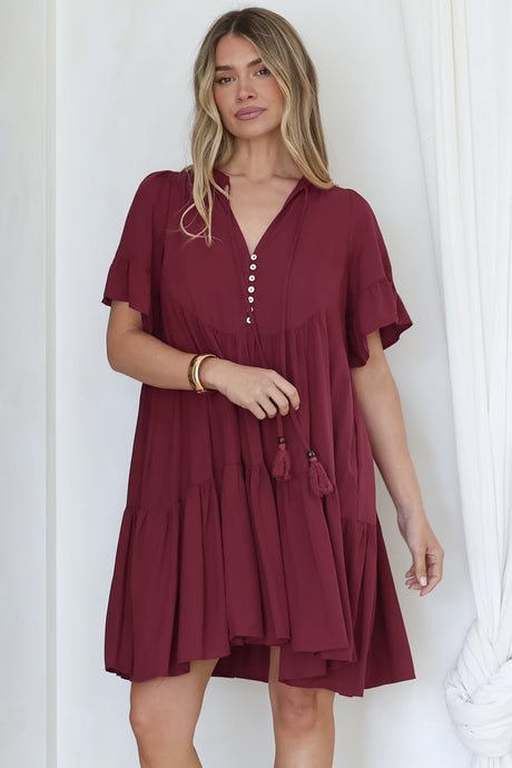 Marah Mini Dress - Mandarin Collar Short Sleeve with Tie Smock Dress in Parisian Polka Rust