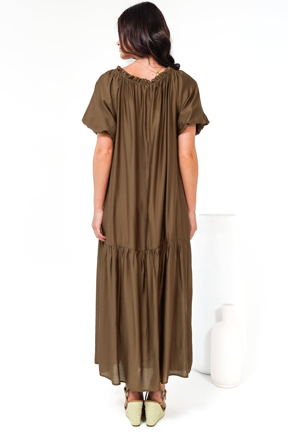 Cristina Maxi Dress - On or Off Shoulder Tiered Shift Dress with Neck Tie Detail in Tan