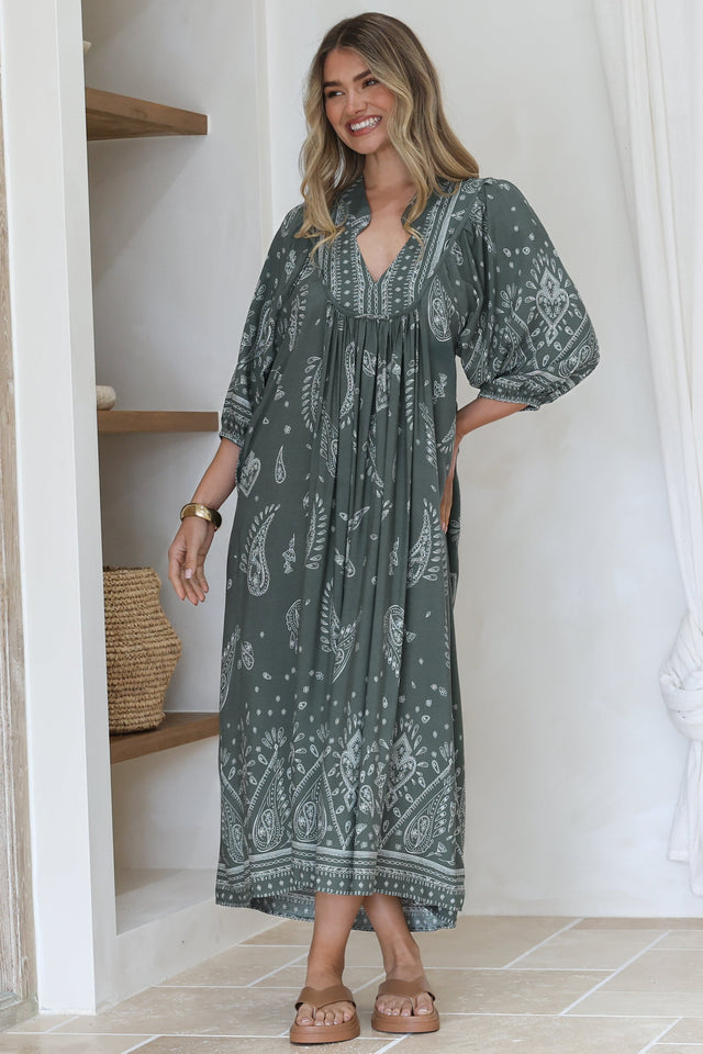 Boheme Midi Dress - Piping Defined Bust Slimline Smock Dress in Kiva Print