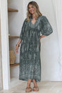 Boheme Midi Dress - Piping Defined Bust 3/4 Sleeve Smock Dress in Grenache Print