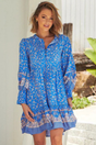 Nirvana Mini Dress - Mandarin Collar with Buttoned Bodice in Turkish Sea Print