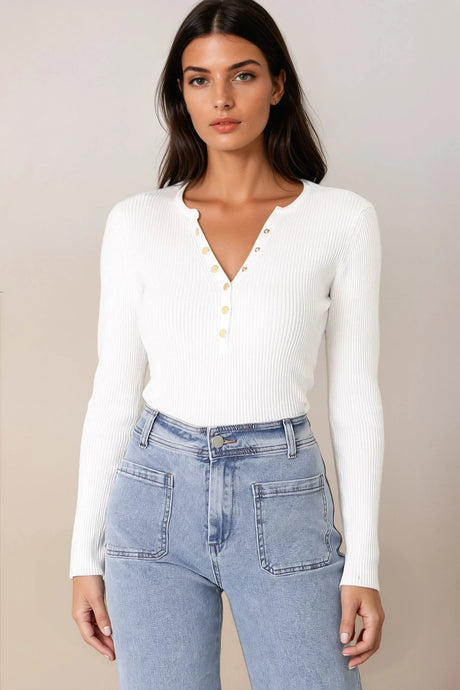Emilia Knit Top - Gold Button Neckline Ribbed Top in White