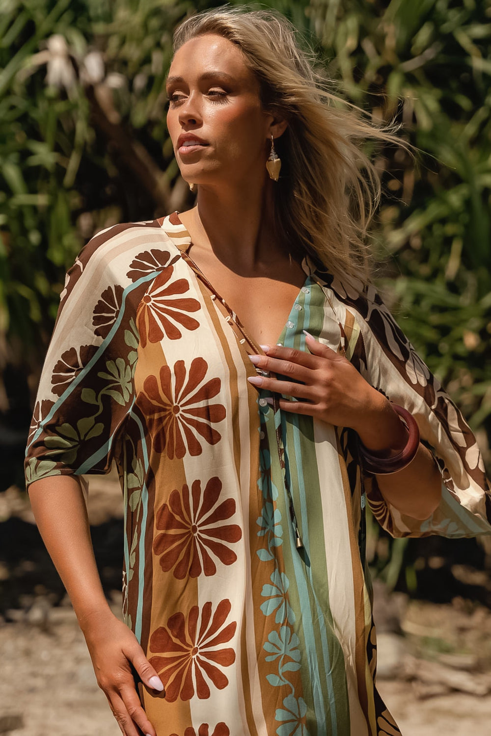 Bree Maxi Dress - Handkerchief Sleeve V Neck Shift Dress in Cacao Mist Print