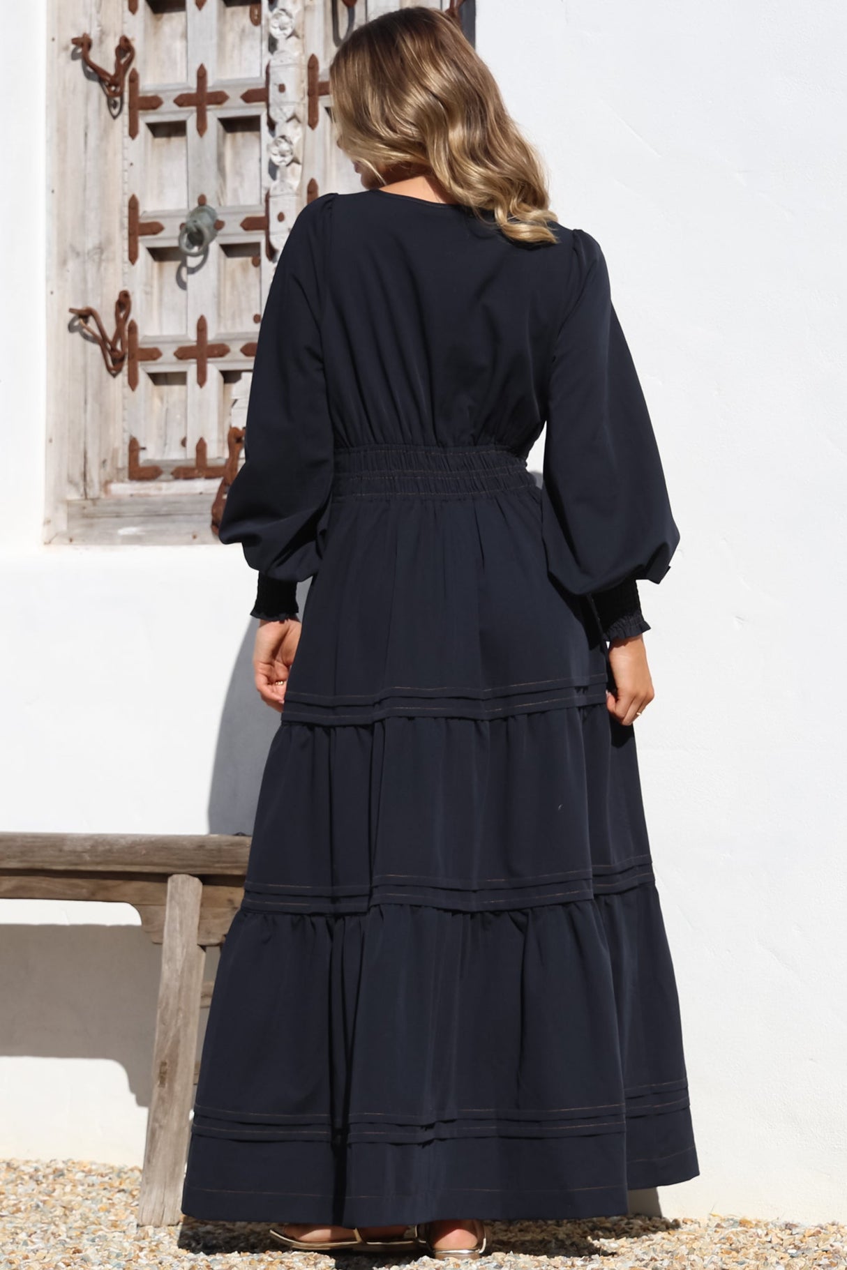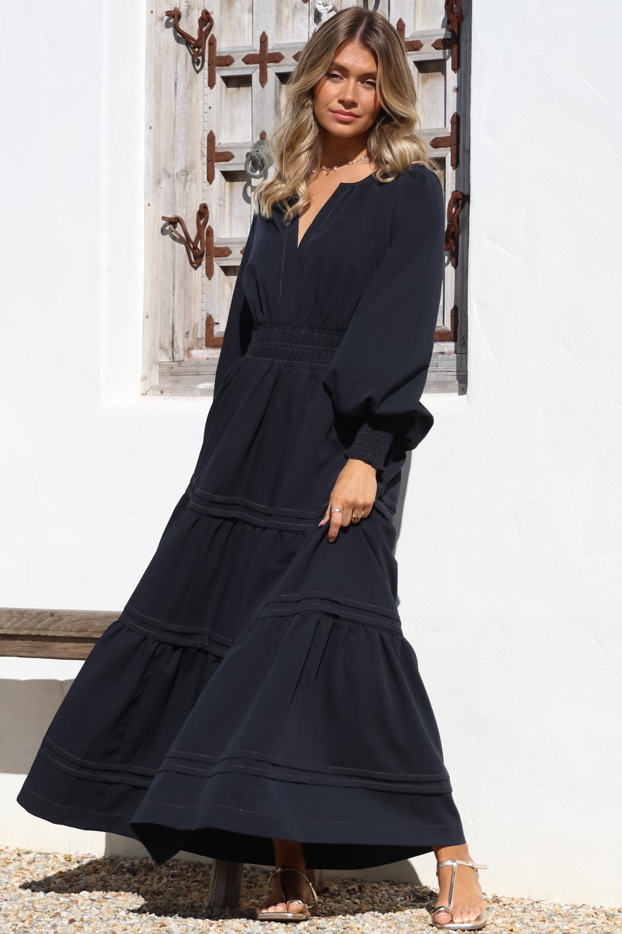 Dara Maxi Dress - Mandarin Collar Tiered Dress with Pockets in Navy