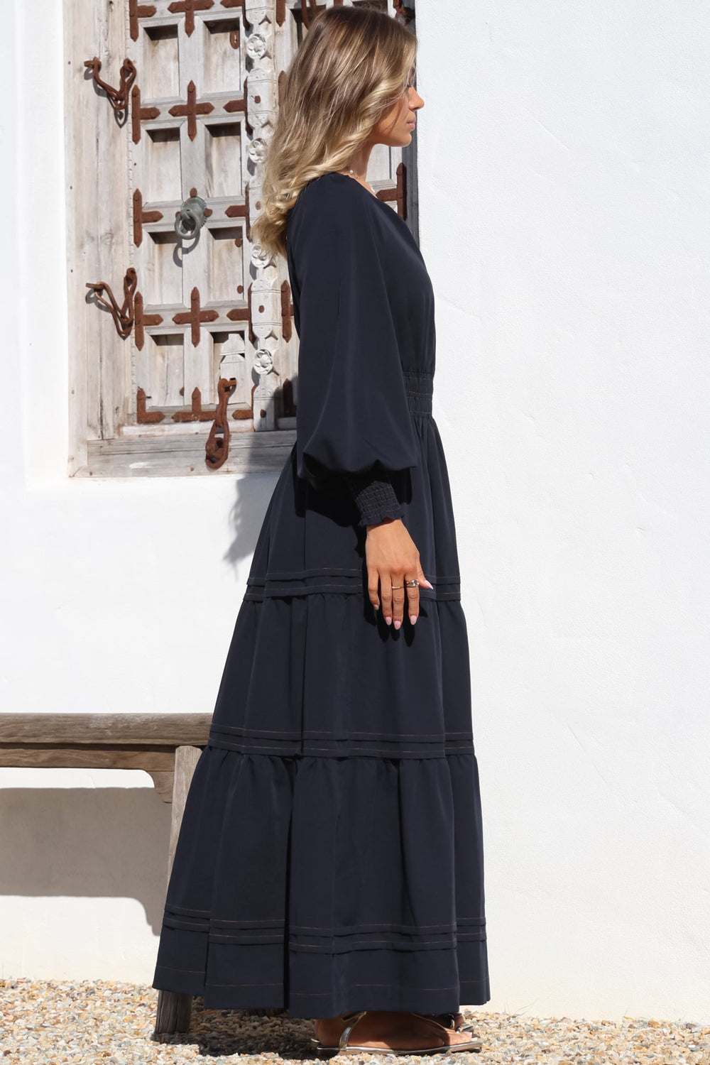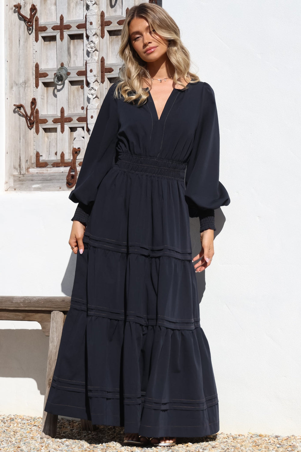 Our Dara Maxi Dress exudes effortless elegance with its flowing silhouette and tiered design, perfect for a sophisticated and comfortable look. Its rich, dark hue and subtle details create a timeless and versatile style.