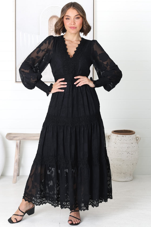 Rouge Maxi Dress - Lace Overlay Tiered Dress in Black