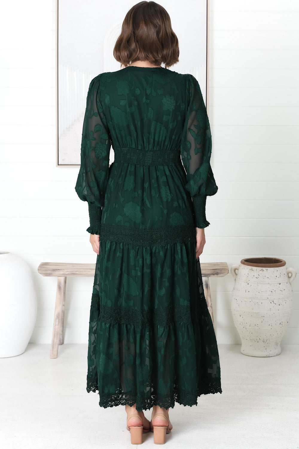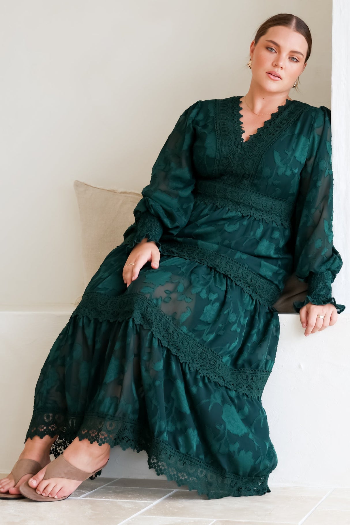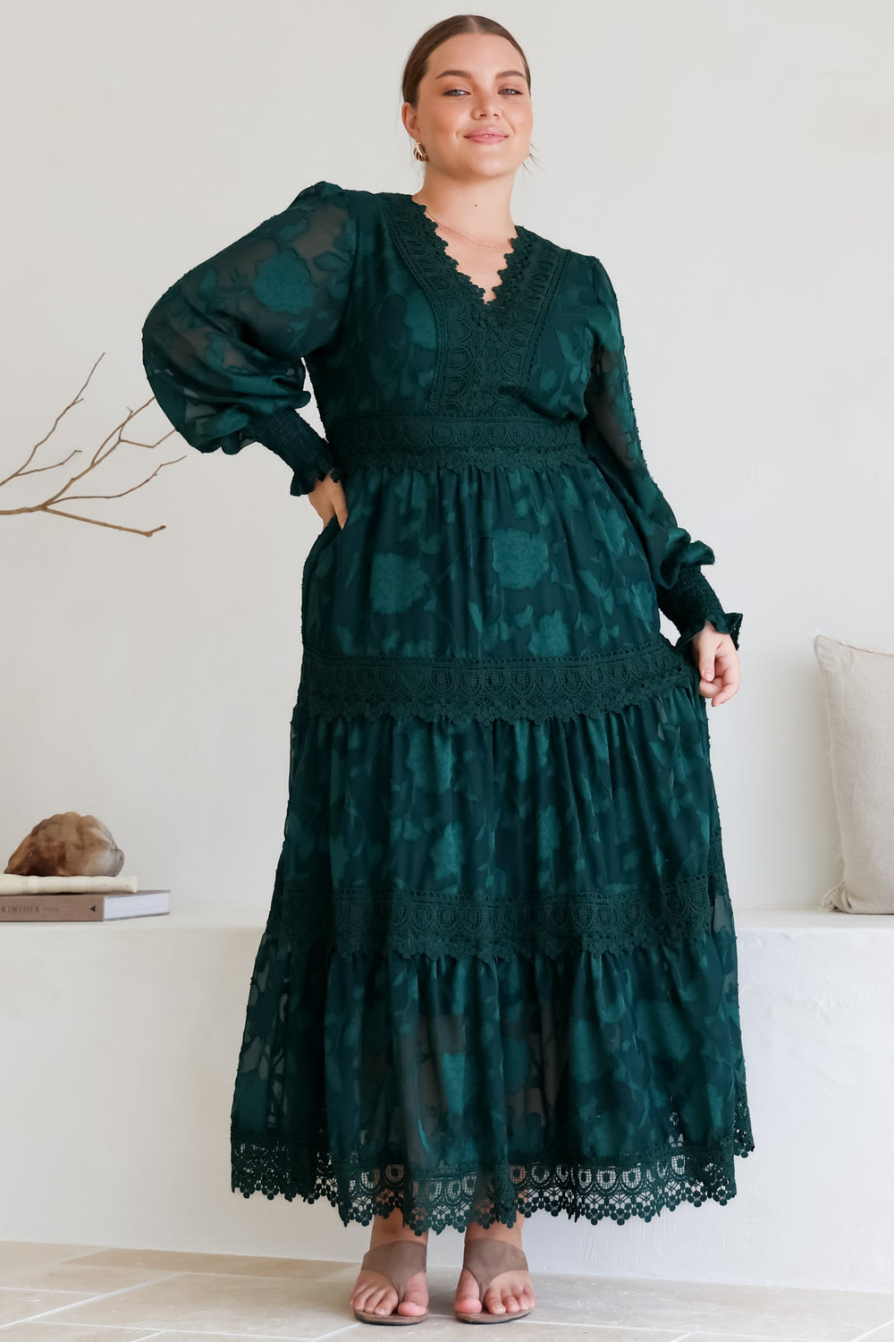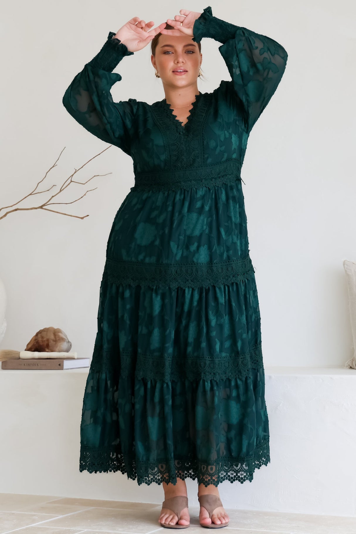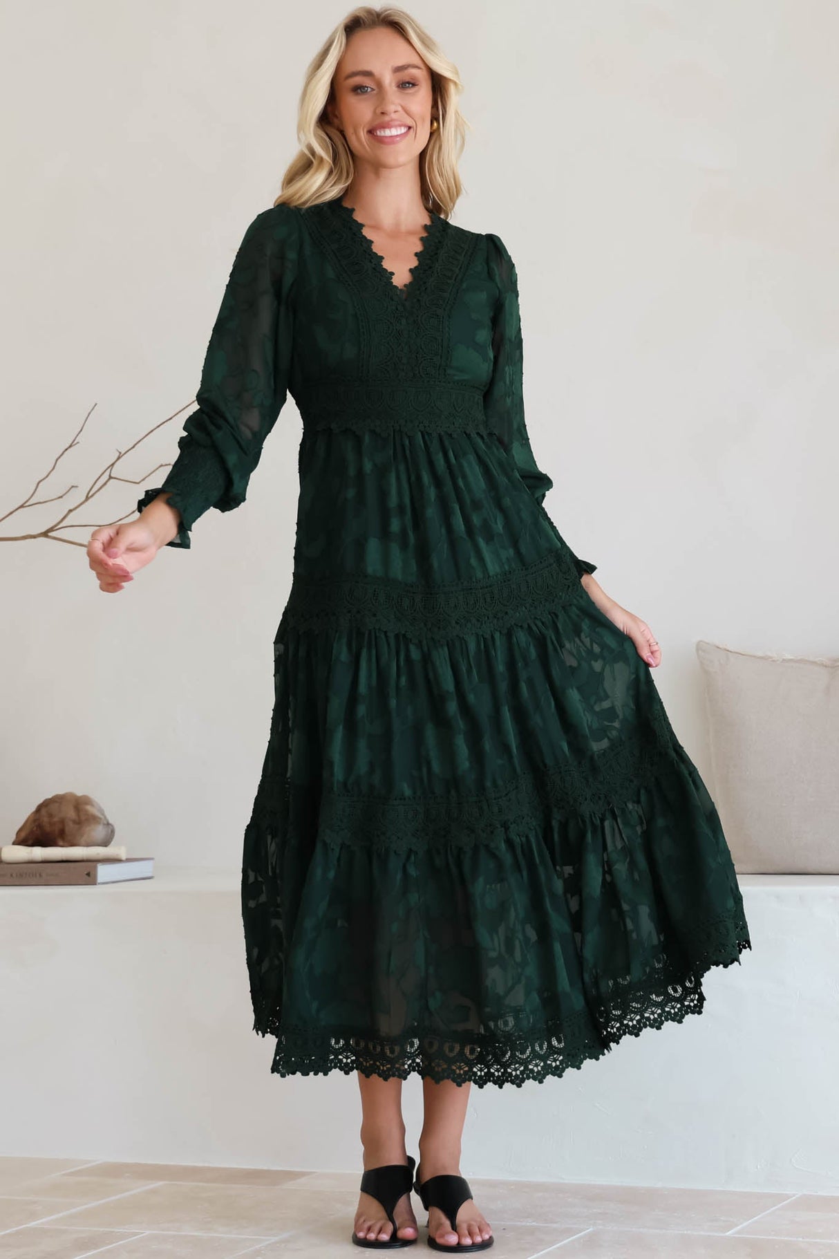 Rouge Maxi Dress - Lace Overlay Tiered Dress in Emerald