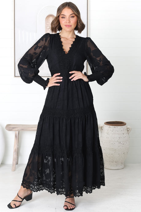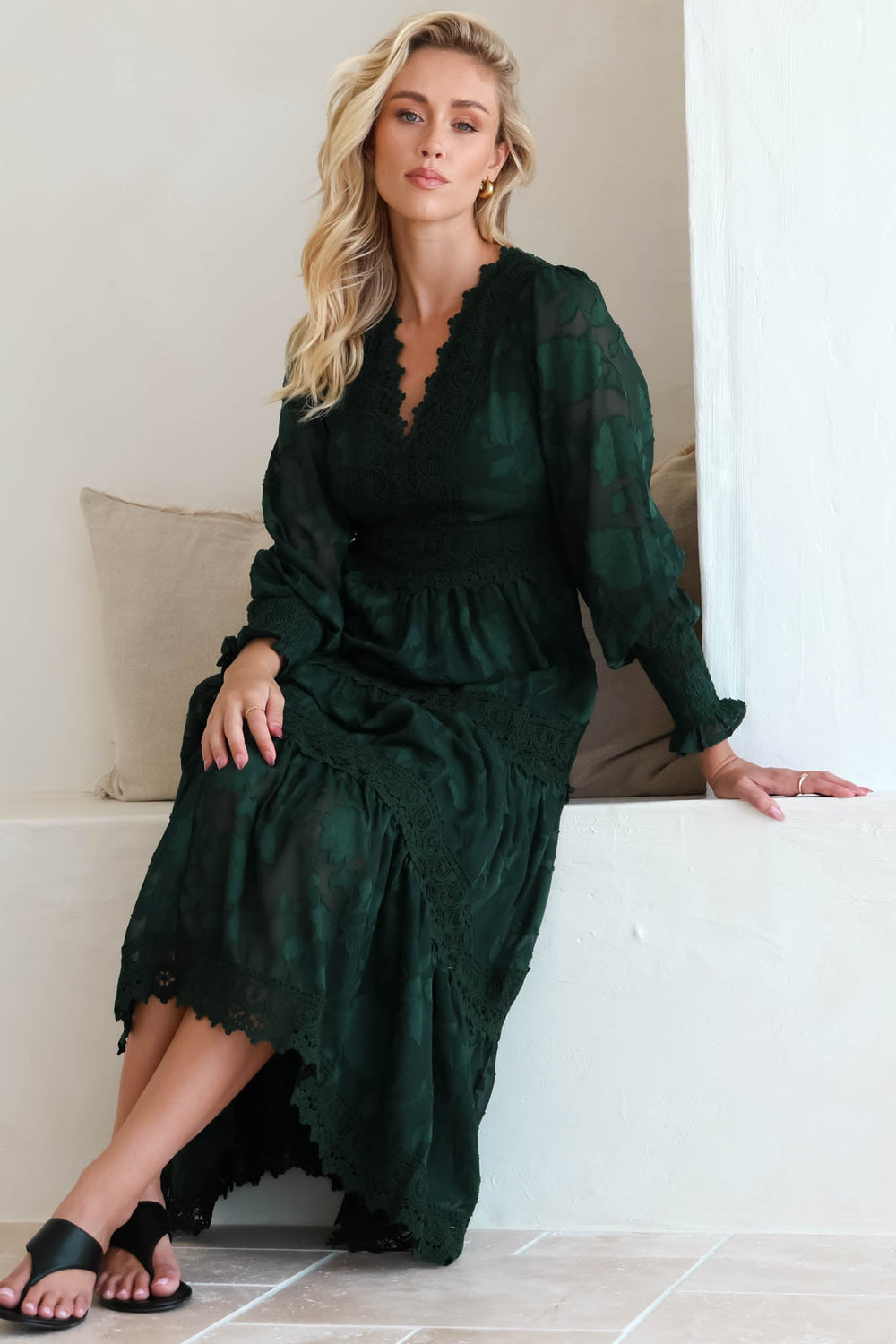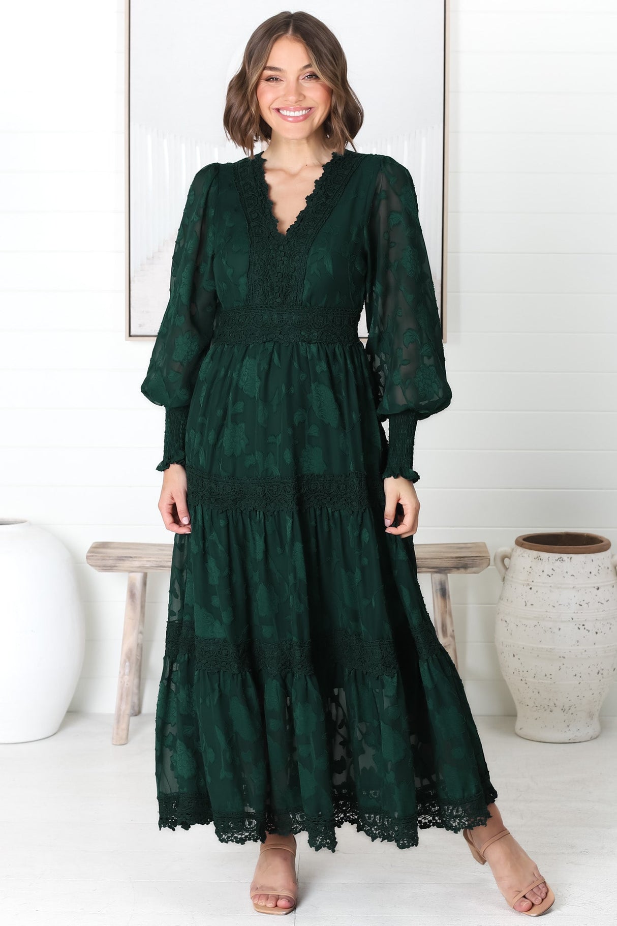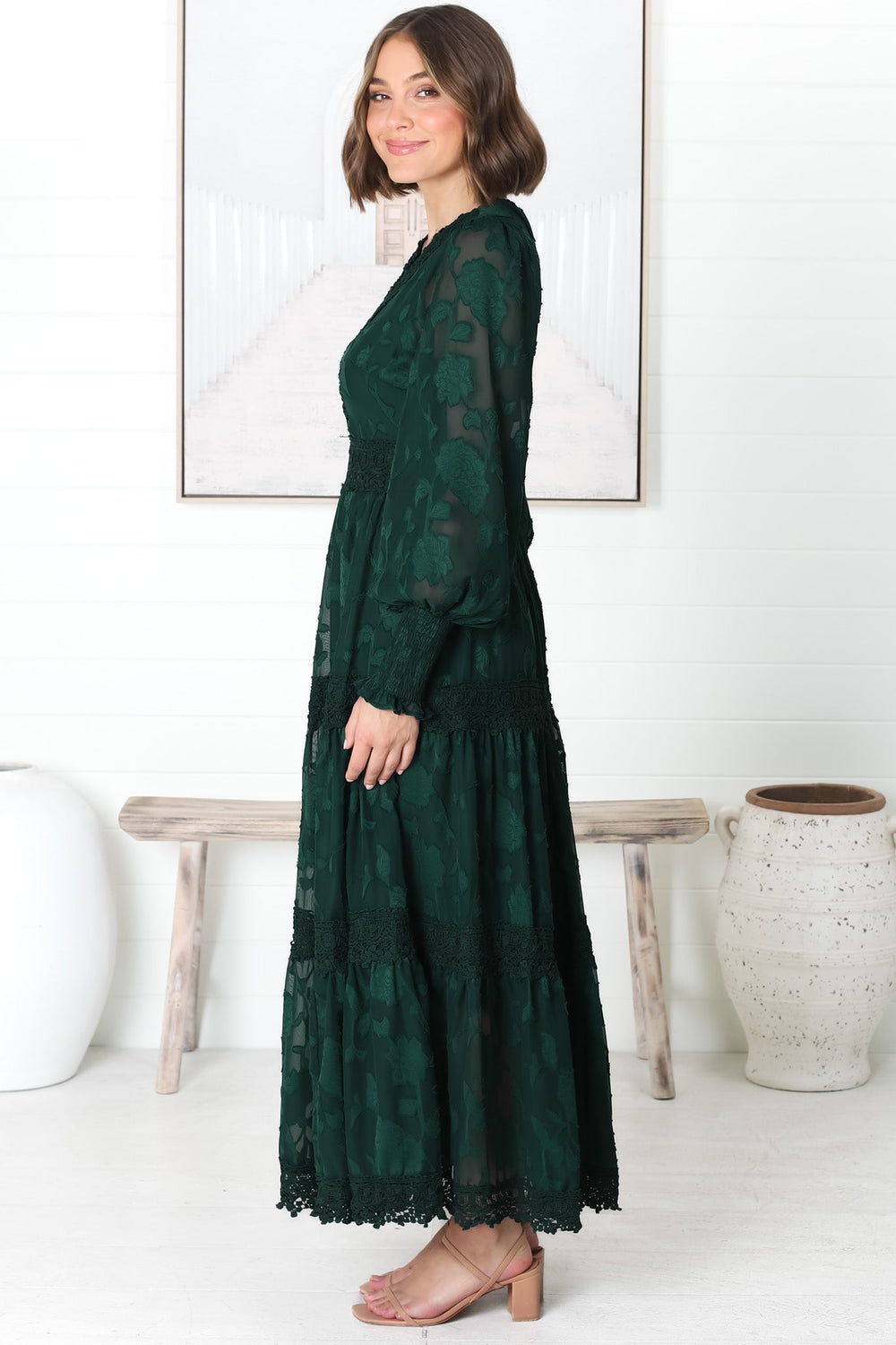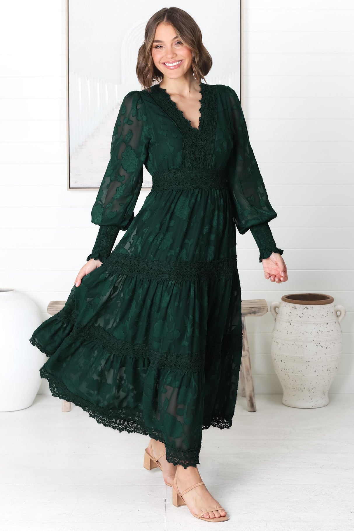 Rouge Maxi Dress - Lace Overlay Tiered Dress in Emerald