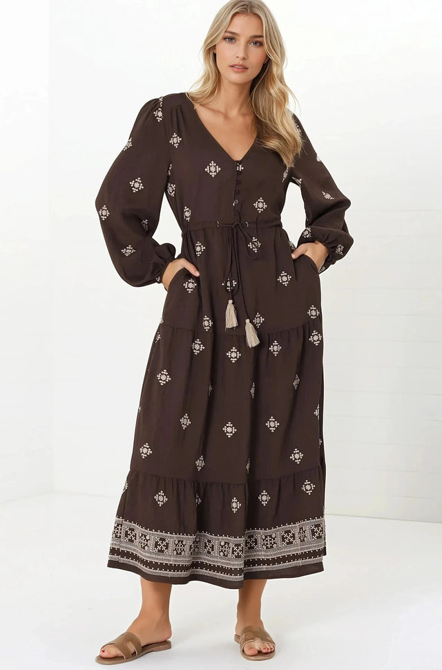Rylie Maxi Dress - Embroidered Long Sleeve Dress with Pull Tie Waist in Vesper Print Brown