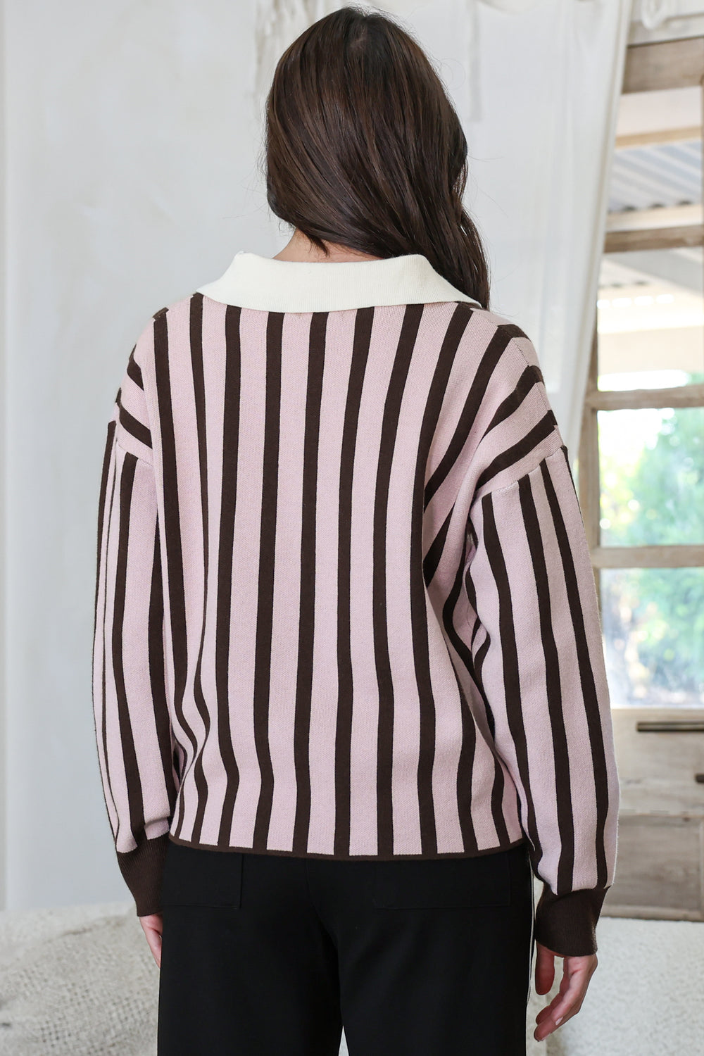 Bishop Jumper - Wing Collar Heart Button Detail Stripe Jersey Knit in Pink/Chocolate