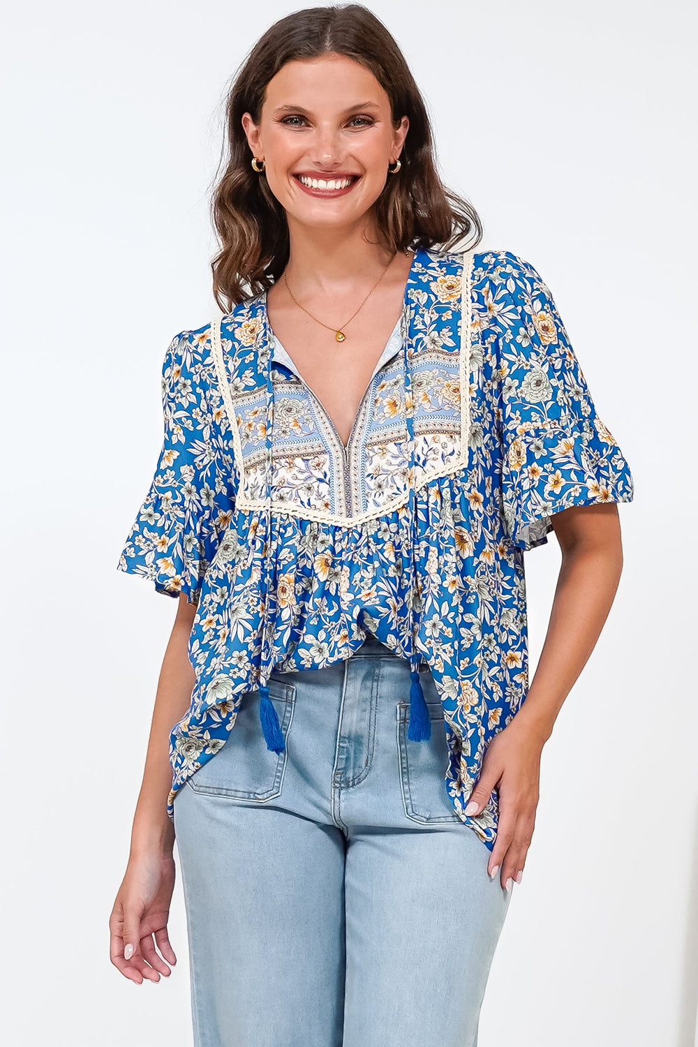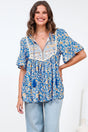 Artisan elegance meets bohemian charm in the Dove Top. Adorned with a vibrant Wynona print featuring delicate florals in rich blue, yellow, and white tones, this statement piece is elevated by intricate embroidered detailing across the yoke and shoulders. The flattering V-neckline and romantic flutter sleeves create a relaxed yet refined silhouette that's perfect for warm-weather styling—pair it with denim, linen pants, or your favourite skirt for effortless, wanderlust-inspired style.