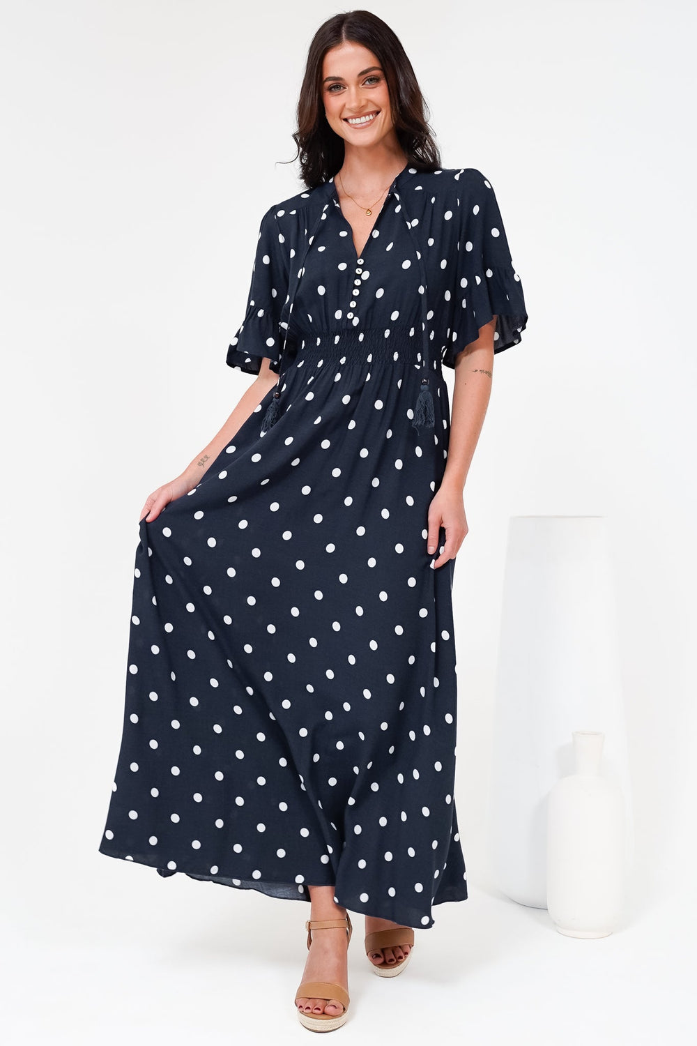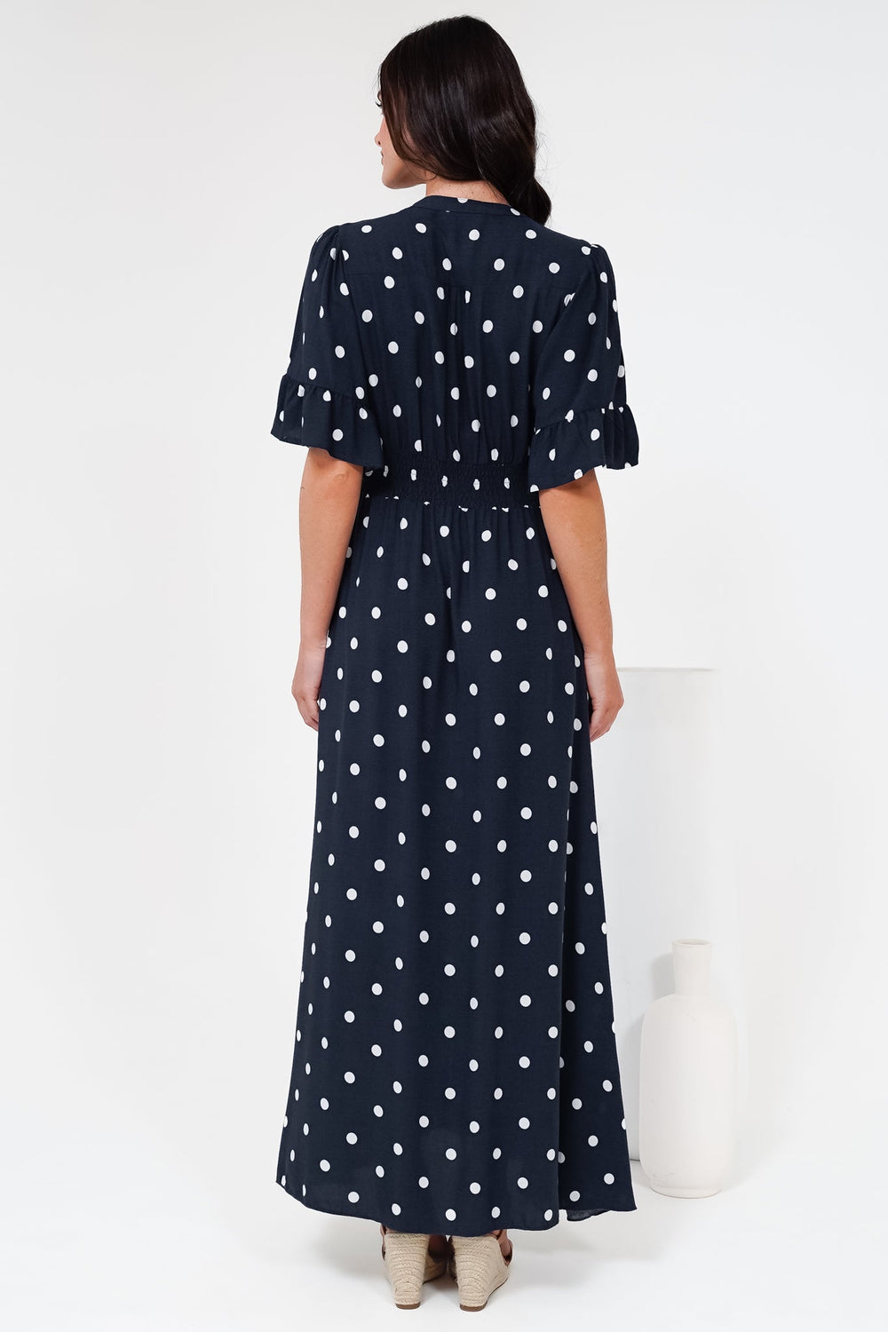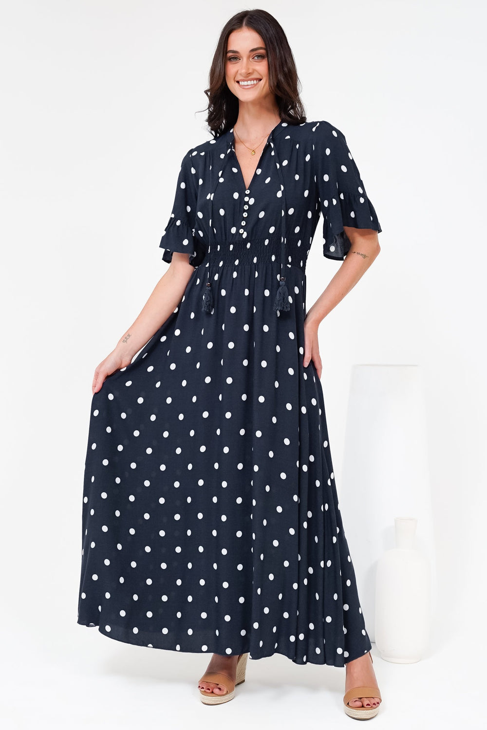Jemina Maxi Dress - V-Neck Elasticated Waist A-Line Dress in Parisian Polka Print Navy