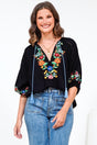 Margerie Top - Floral Embroidered Top with 3/4 Sleeves in Black