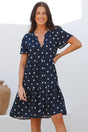 Wilma Mini Dress - Bermuda Collar Button Down Dress with Cap Sleeves in Parisian Polka Navy