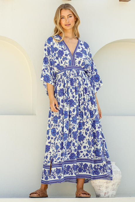 Zelle Maxi Dress - V Neck Batwing Sleeve Dress with Side Splits in Kailin Print Blue