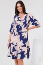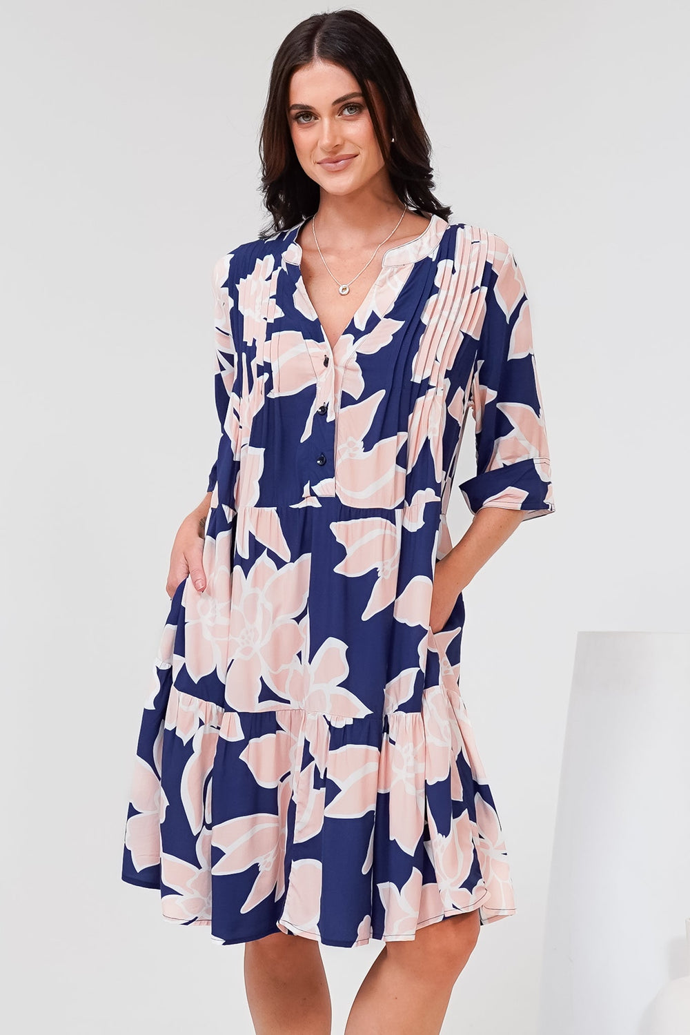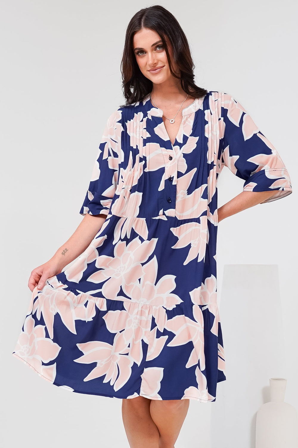 Evie Mini Dress - 3/4 Sleeve Tiered Smock Dress in Jetson Print Navy