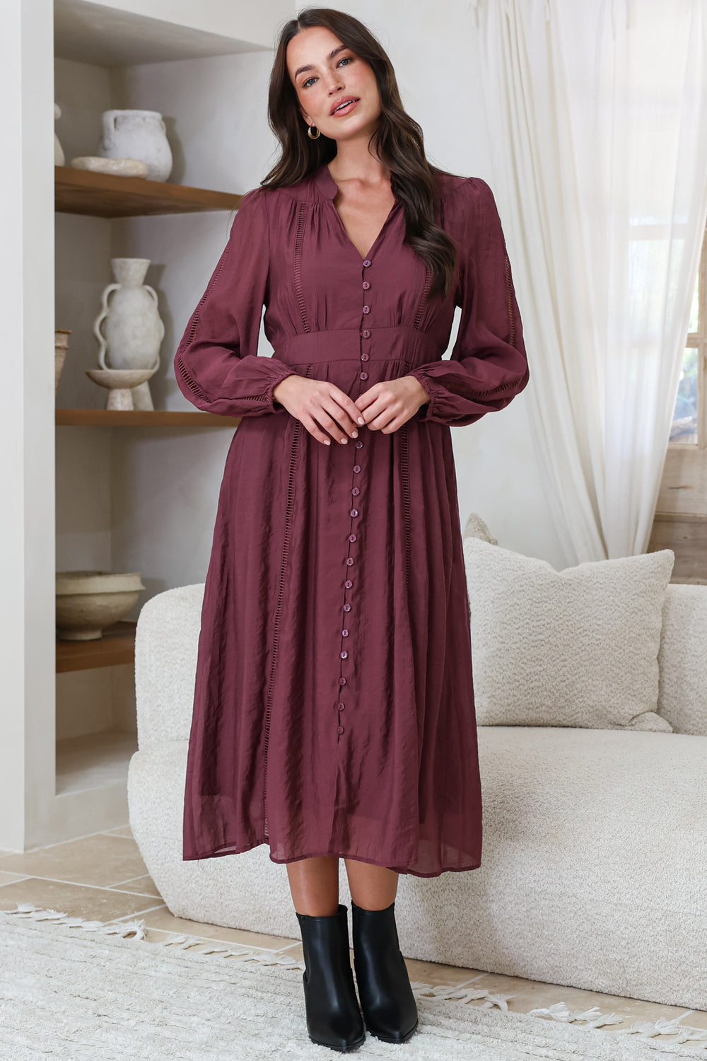 Aylon Midi Dress - Delicately Detailed Mandarin Collar Dress with Long Sleeves in Merlot