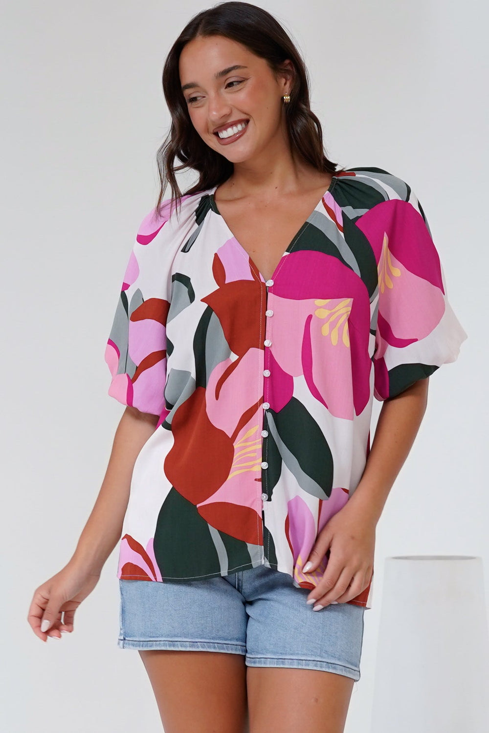 Zera Blouse - V Neck Button Down Blouse with 3/4 Sleeves in Perdita Print