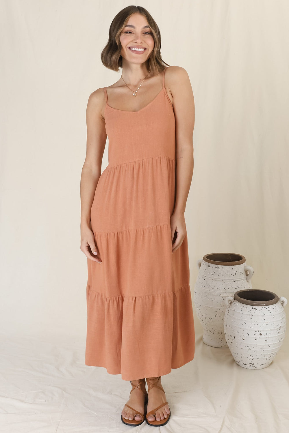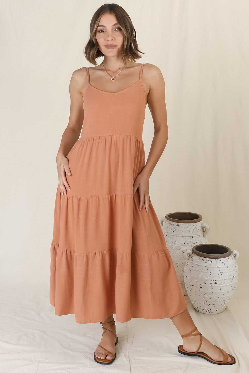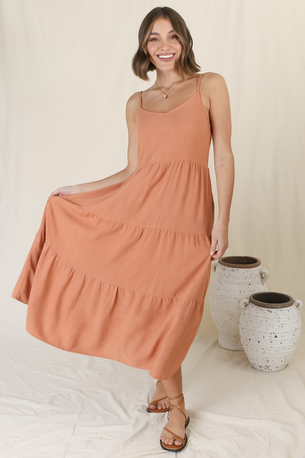 Arlowe Midi Dress - Soft V Neckline Tiered Linen Sun Dress in Rust