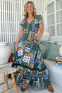 Carmen Maxi Dress - Butterfly Cap Sleeve Button Down A Line Dress with Lace Trim in Emerald Cove Print